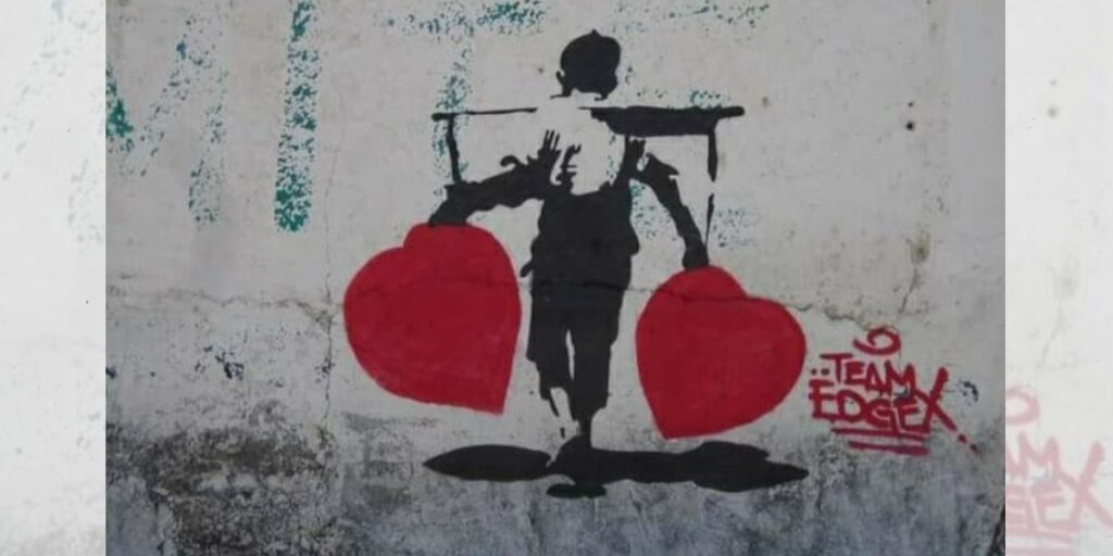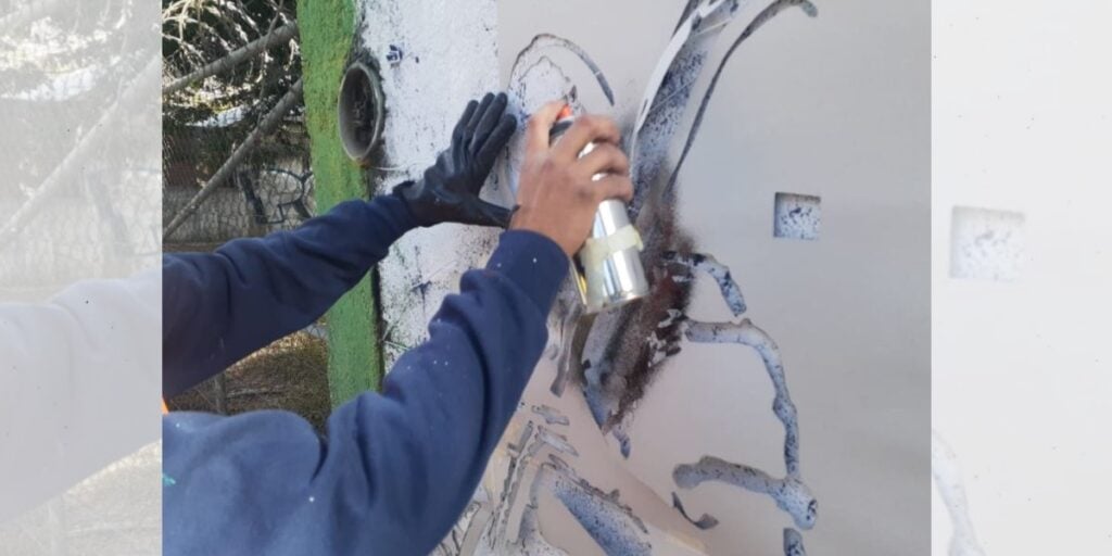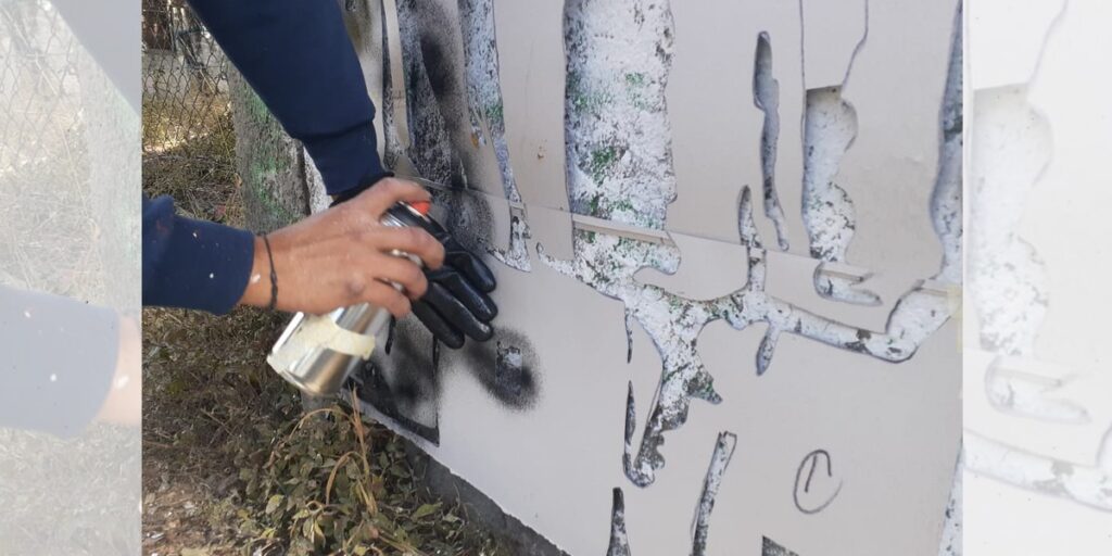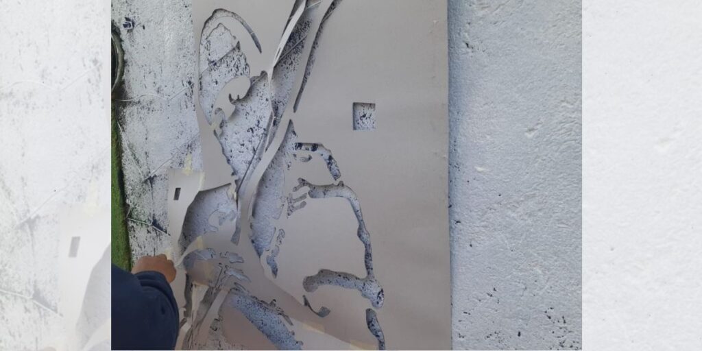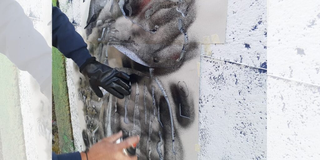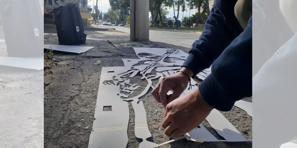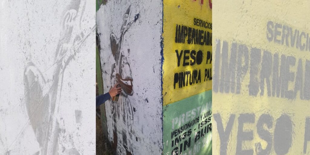 En la barda pintada parcialmente de color blanco reposa el rompecabezas de cartón, fabricado a mano para dar forma a su nueva creación. Agita una lata de pintura en aerosol color negro y dispara. Nunca ha pedido permiso para realizar una obra. Coincide con el alegato de quienes sostienen que sí es legal, ya no es graffiti. Lo hace por las mañanas porque así le resulta más fácil pasar desapercibido.