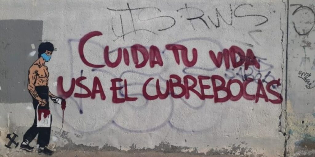 En la avenida Malecón del Río de los Gómez, en la lateral del puente de la avenida Insurgentes, la inconfundible silueta de un reconocido artista marcial invita a usar el cubre bocas. Es Bruce Lee.