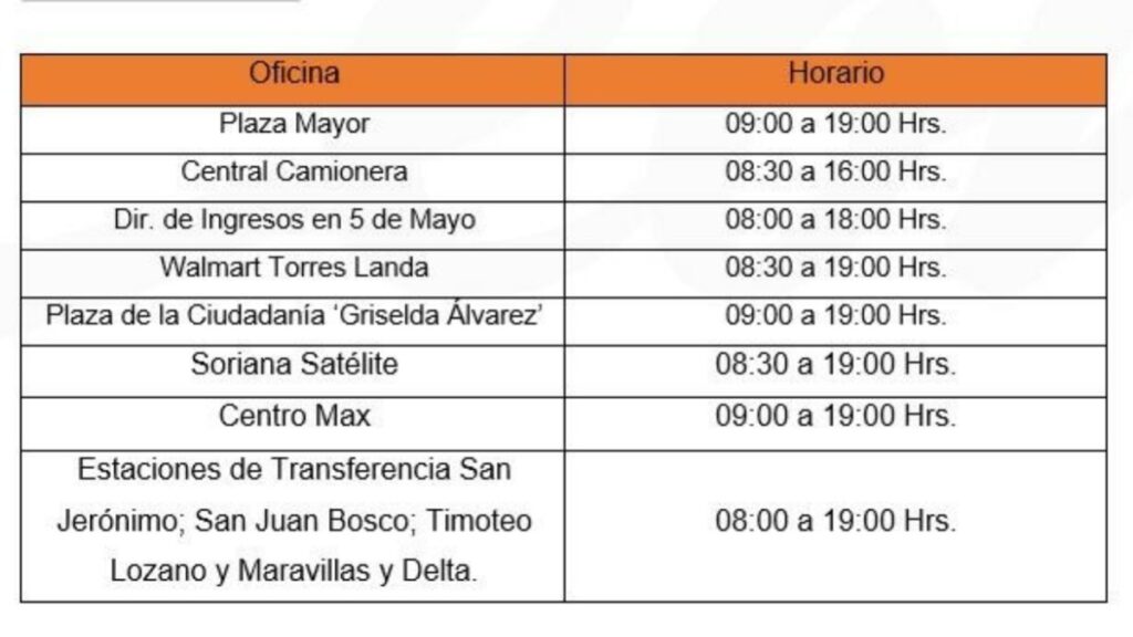Las oficinas de Ingresos ubicada en la calle 5 de Mayo, la de la Plaza de la Ciudadanía Griselda Álvarez y las ubicadas en las Centrales de Transferencia permanecerán abiertas a partir de las 8 de la mañana y las oficinas de plazas comerciales, a partir de las 9 de la mañana.