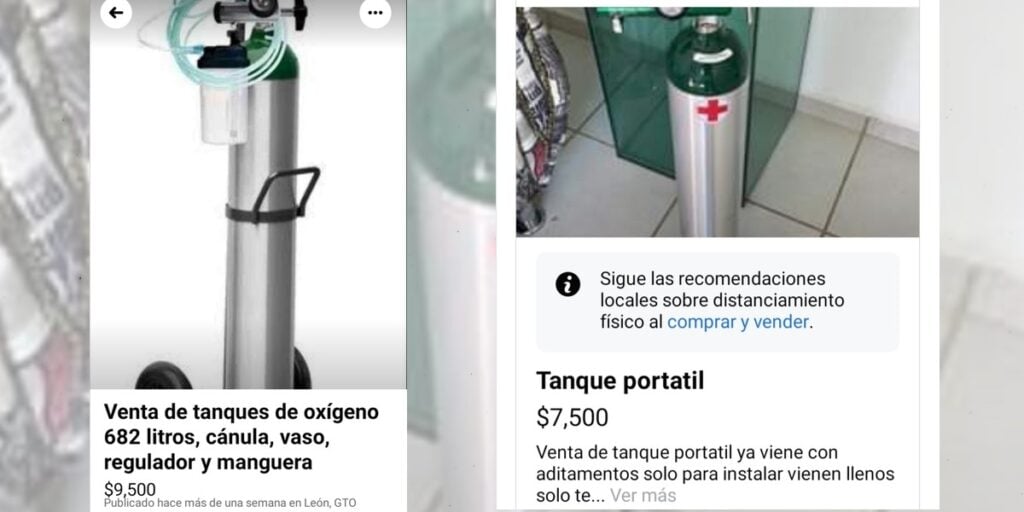 “Ya había mucho ‘coyotaje’ para el mejor postor, carísimo, ya me tocó a mí, ayer fui a espaldas de Bomberos atrás de la deportiva entonces no me quisieron llenar, pero luego, luego se me arrimaron tres o cuatro personas entregando tarjetitas que decían que estaban en el Parque y que ahí lo llenaban de volada; y ahí estaban, haciendo su ‘agosto’, yo espero que con esto ahora sí le van a bajar”, mencionó el ciudadano leonés.Aprovechan urgencia y venden tanques a sobreprecio por internetAlgunas personas que acuden a las distribuidoras ubicadas en León denuncian el incremento en los costos de tanques de oxígeno por internet.En Facebook son comunes los grupos de internautas relacionados a la pandemia de COVID-19 y la venta de tanques para oxígeno medicinal llega a darse desde los 7 mil 500 pesos hasta los 40 mil pesos, dependiendo su capacidad.