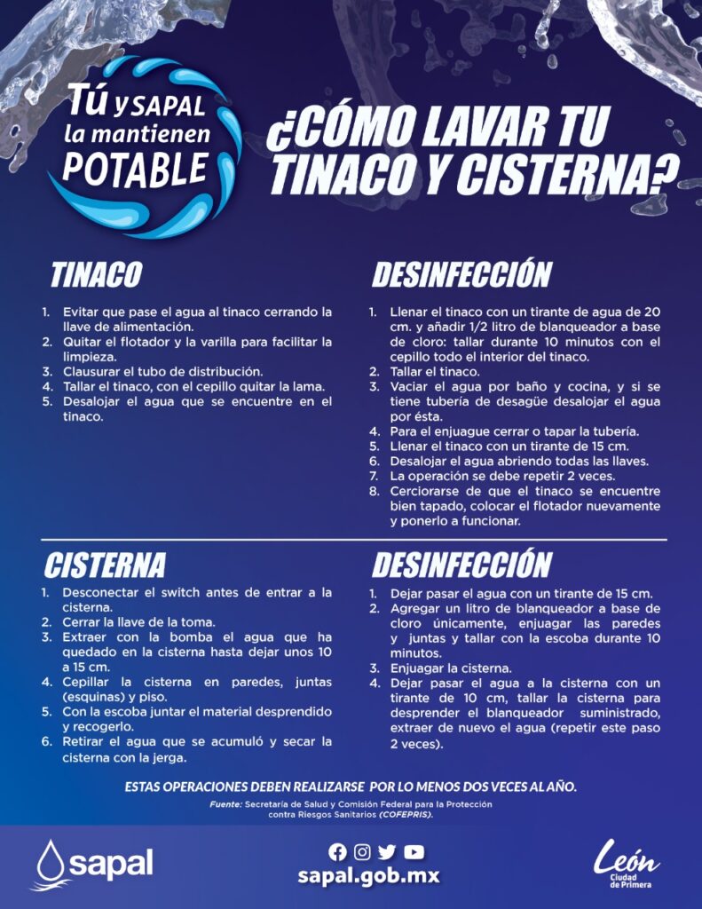 Pese a que SAPAL entrega agua a los leoneses con el 99.4% de potabilidad, la paraestatal llamó a la ciudadanía a realizar la limpia de sus tinacos, cisternas y aljibes, con el objetivo de mantener la calidad del agua que se les entrega.