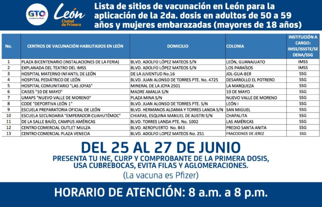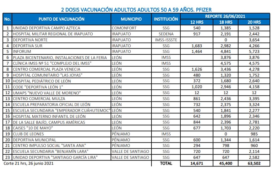 Un total de 133 mil 902 personas de entre 50 y 59 años ya fueron inmunizadas con la segunda dosis de la vacuna Pfizer; este domingo resta la aplicación de 17 mil 208 guanajuatenses.