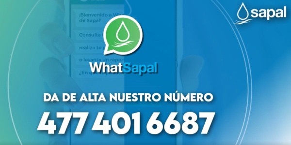 Con la finalidad de agilizar la comunicación con los usuarios, el Sistema de Agua Potable y Alcantarillado de León (SAPAL), pone a disposición el número 477 401 66 87, como línea de atención WhatsApp.