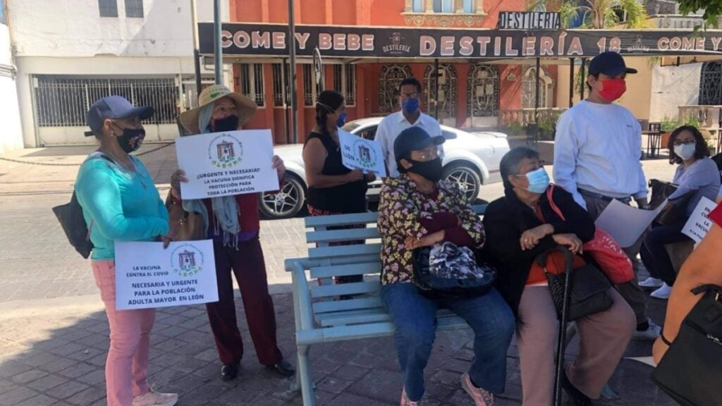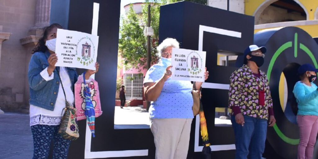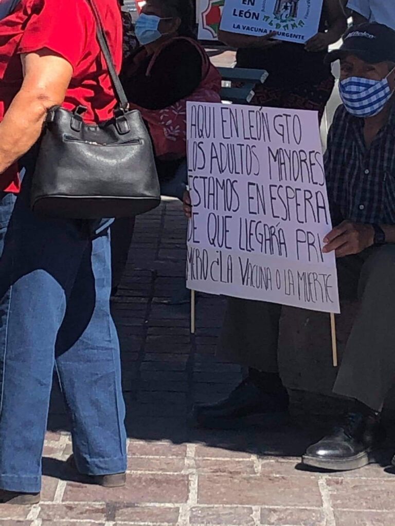 “Aquí en León los adultos mayores estamos en espera de qué llegará primero: ¿la muerte o la vacuna?” se leyó en los carteles de algunos ciudadanos de la tercera edad.