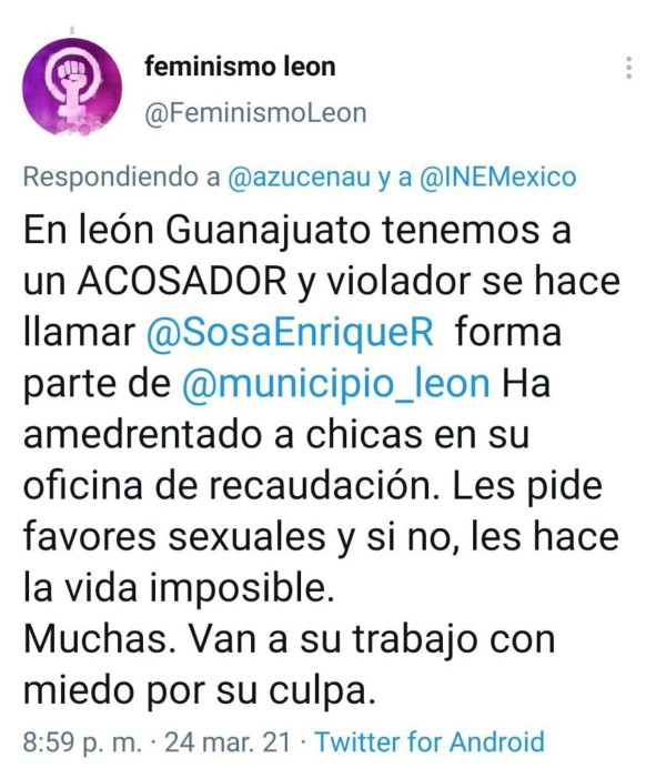Alrededor de las 8:59 pm de este miércoles 24 de marzo a través de la cuenta de Twitter @FeminismoLeon se denunció que el funcionario municipal de la administración de Héctor López Santillana, amedrenta y pide favores sexuales, valiéndose de su cargo.