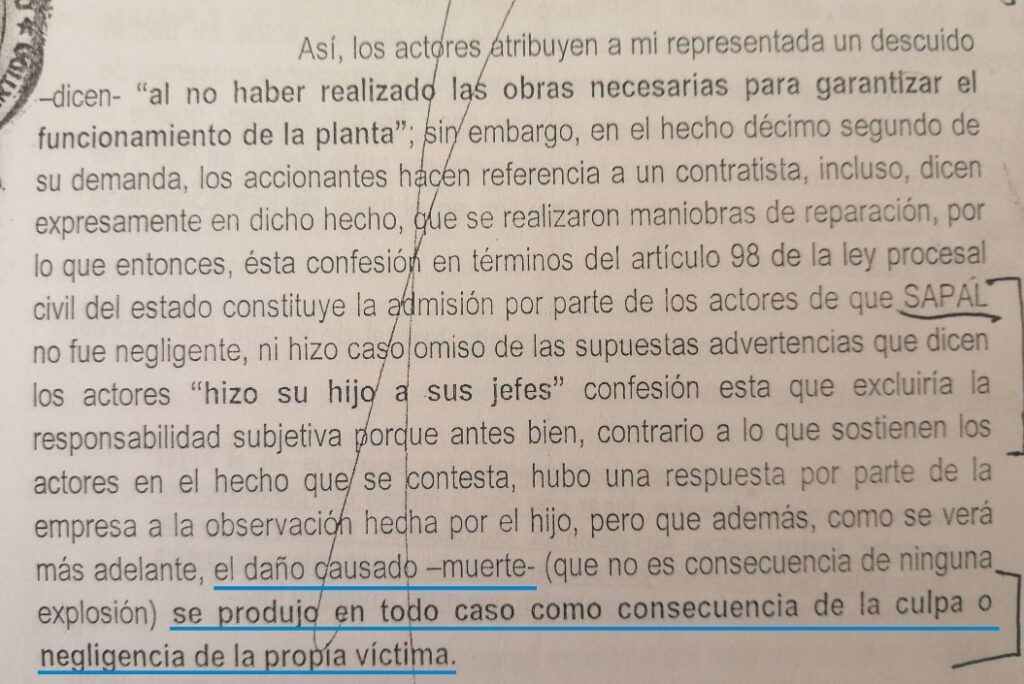 “En la contestación de la demanda por responsabilidad civil que han interpuesto los padres de Víctor Ricardo Briseño Rangel, uno de los trabajadores fallecidos el 13 de noviembre de 2020, el apoderado legal del SAPAL (…) señala que