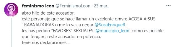 La denuncia de acoso sexual y laboral salió de la cuenta @FeminismoLeon en Twitter, donde señalan al tesorero de abusar de su cargo.
