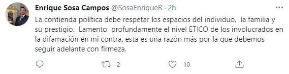 “La contienda política debe respetar los espacios del individuo, la familia y su prestigio. Lamento profundamente el nivel ETICO de los involucrados en la difamación en mi contra, esta es una razón más por la que debemos seguir adelante con firmeza”, publicó.