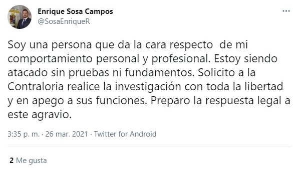 “Soy una persona que da la cara respecto de mi comportamiento personal y profesional. Estoy siendo atacado sin pruebas ni fundamentos. Solicito a la Contraloría realice la investigación con toda la libertad y en apego a sus funciones. Preparo la respuesta legal a este agravio”, precisó.