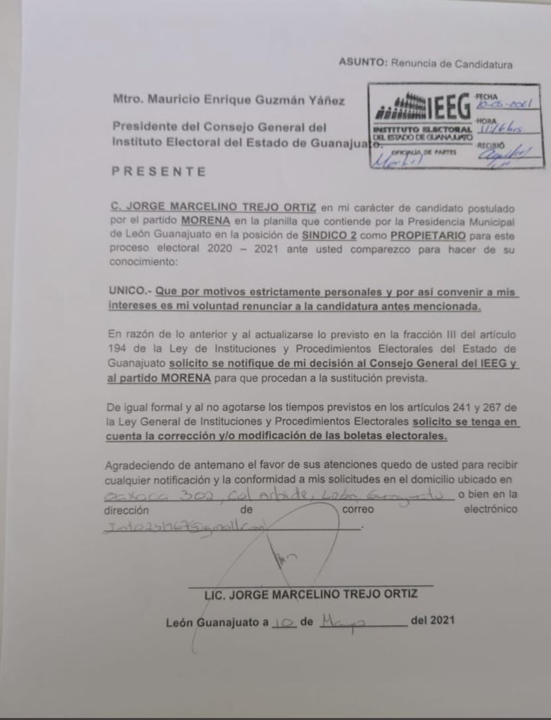 La tarde de este lunes el abogado Marcelino Trejo, candidato a la segunda sindicatura en la Planilla del Ayuntamiento registrada por Morena, presentó su renuncia ante el Instituto Electoral del Estado de Guanajuato, IEEG.