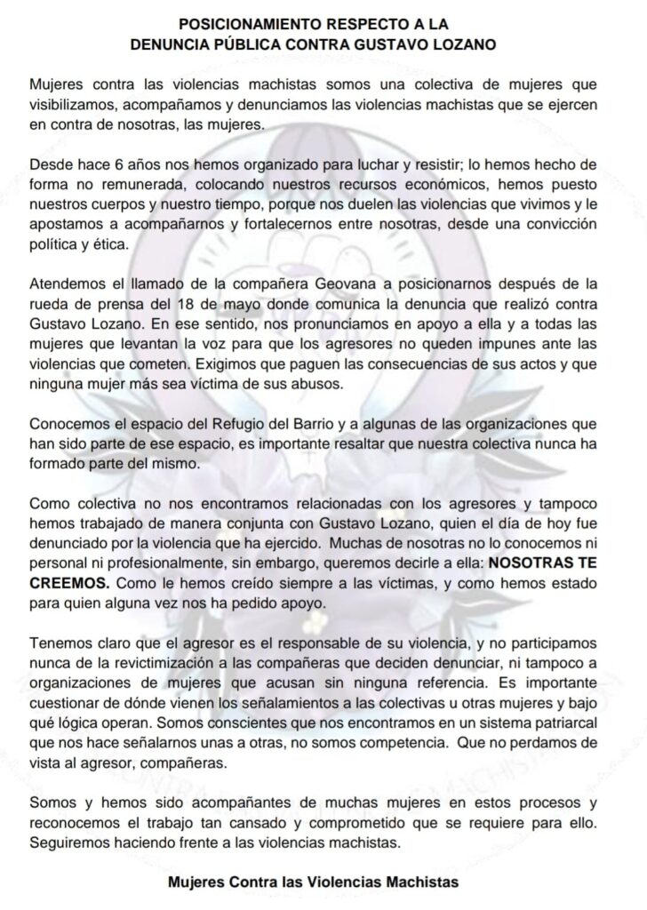 La activista reclamó que al interior de la organización en la que velaba por los derechos humanos de la sociedad no hay congruencia, ya que incluso colectivos feministas fueron testigos de la violencia física de la que fue víctima por parte de Gustavo Lozano y estas pasaban por alto los abusos de los que eran testigos.