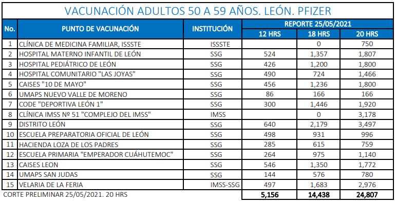 De las más de 35 mil dosis de la farmacéutica Pfizer que se pretendían a aplicar en el primer día de la jornada de vacunación para personas de 50 a 59 años y mujeres embarazas en León, solo se aplicaron 24 mil 807 dosis de vacuna anticovid-19.