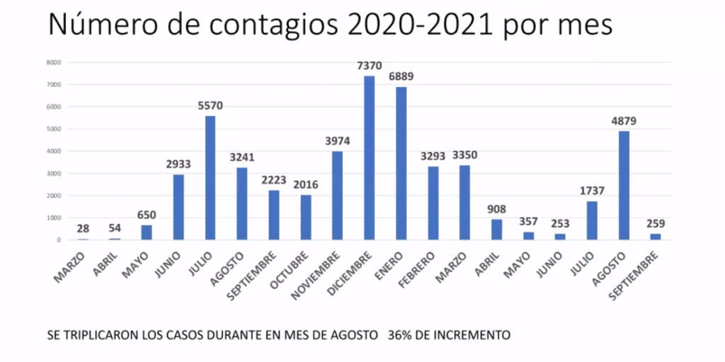 En agosto se cerró con un número de contagios de 4 mil 879 casos, lo que representa un aumento de casi cuatro veces el número de positivos que se registraron en el mes de julio.