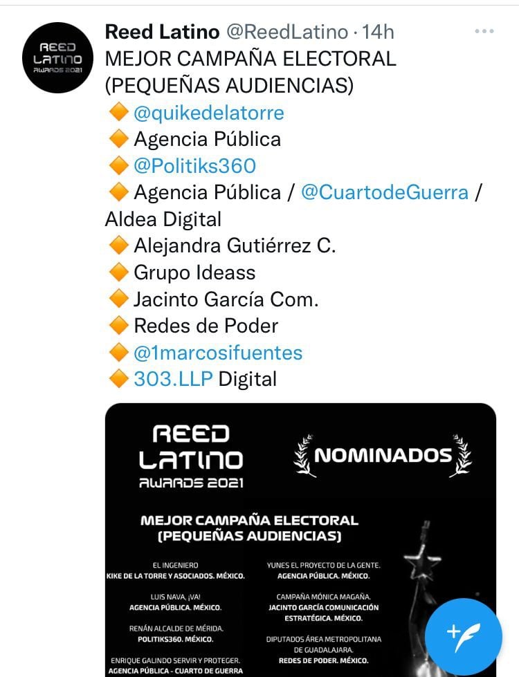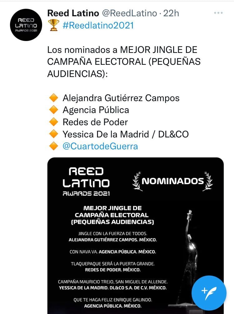 La campaña electoral de la panista, Alejandra Gutiérrez Campos está nominada en dos categorías de los Reed Latino Awards, considerados como los premios más importantes de la comunicación política y de gobierno.