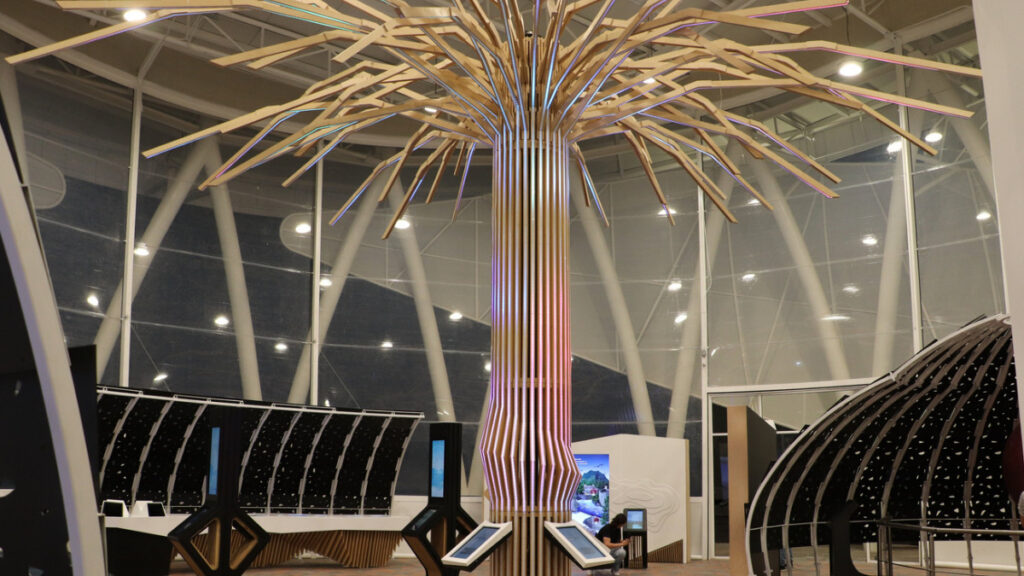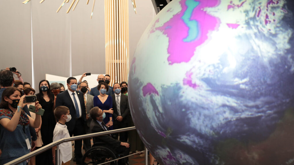 El edificio cuenta con una área museográfica que tiene 12 exhibiciones en donde se abordan temas de liderazgo socioambiental, agua, cuenca, ciudades humanas e inteligentes, ciudades sostenibles, suelo y sustento y economías alternativas, además de un vanguardista sistema de proyección mundial llamado “ciencia en la esfera” donde es posible ver el comportamiento de las nubes, temperatura, precipitaciones, vuelos de aviones, migraciones de tortugas y más, gracias a la colaboración con la Administración Nacional de Océanos y Atmósfera de Estados Unidos.