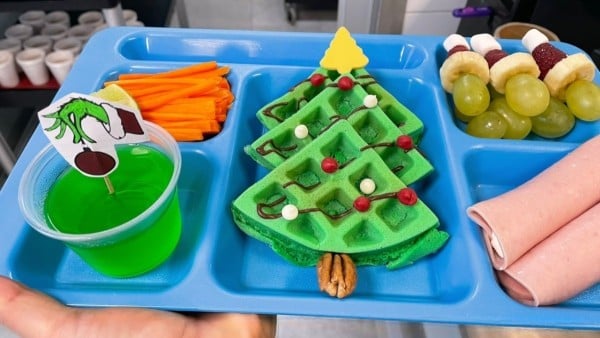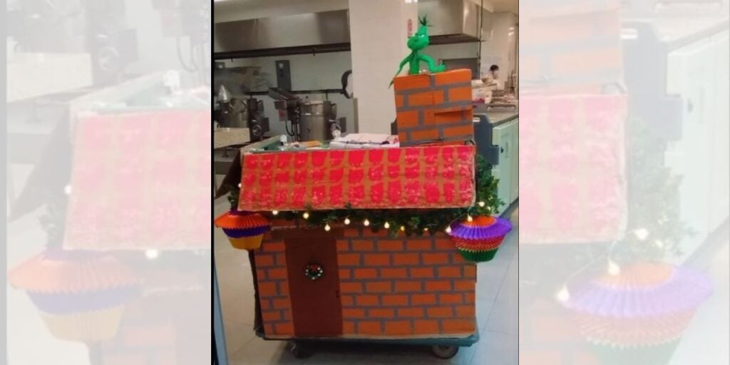 Con figuras de árbol de navidad comestibles en el platillo, unos con gorritos navideños, gelatina verde, con trozos de jamón de proteína los platillos decorativos son trasladados por los pasillos del área de pediatría a bordo de una charola montada sobre un carrito en forma de chimenea.