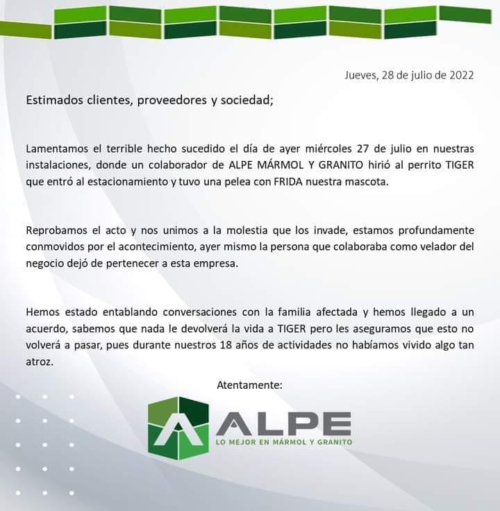 La empresa ALPE emitió un comunicado de prensa en el que señala que el velador fue despedido. Argumentan que Tiger “entro al estacionamiento y tuvo una pelea con FRIDA (SIC) nuestra mascota”.