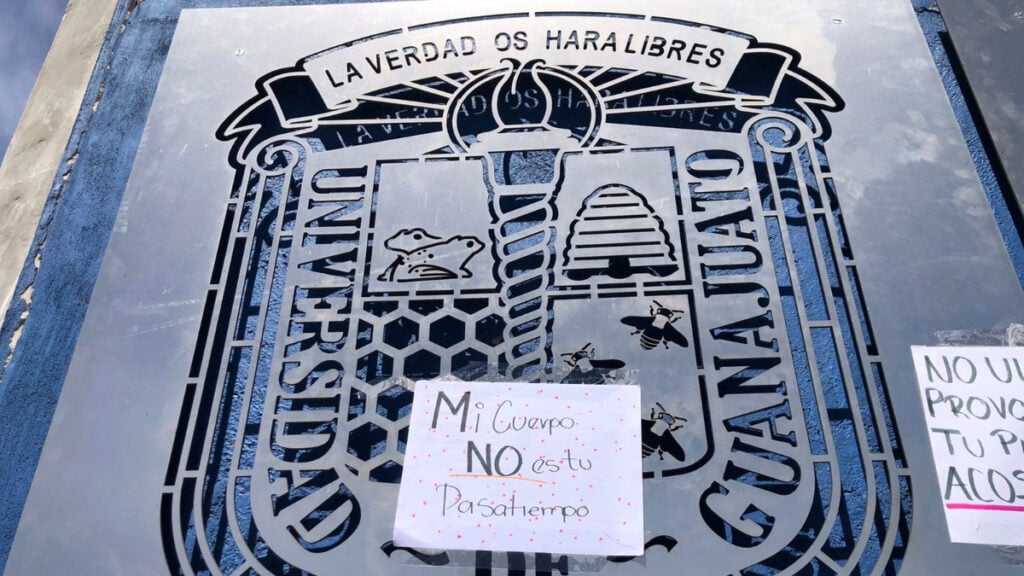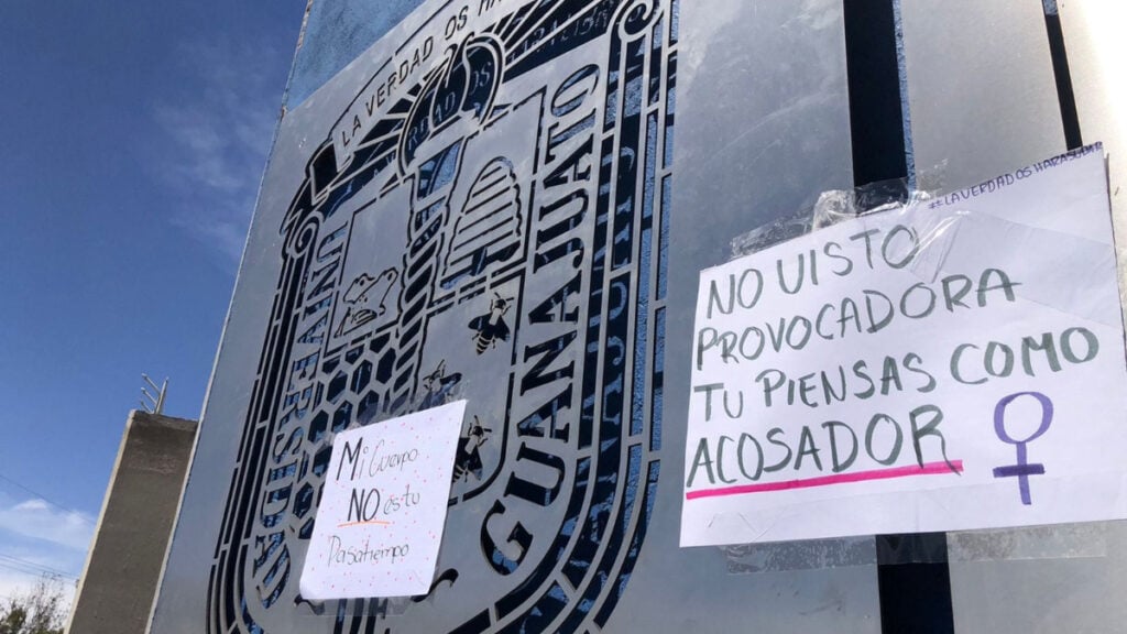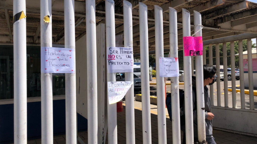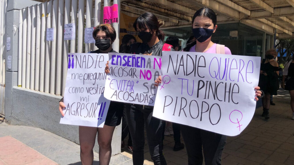“Mi violador estudia aquí y lo protegen más a él”, “Mi cuerpo, mi forma de vestir”, “Combatan el acoso no mi forma de vestir”.