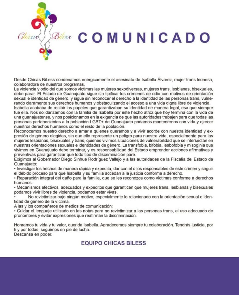 “Desde Chicas BiLess condenamos enérgicamente el asesinato de Isabella Álvarez, mujer trans leonesa, colaboradora de nuestros programas”, señala el documento.