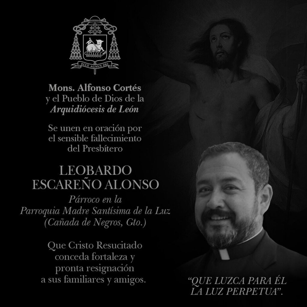 El día de mañana a las 11:00 a.m. en la parroquia Madre Santísima de la Luz-Cañada de Negros, será la celebración de exequias del sacerdote Presbítero Leobardo Escareño y presidirá Monseñor Alfonso Cortés, Arzobispo de León.