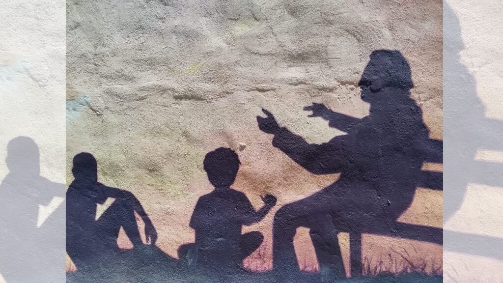 Un adulto de la tercera edad comparte un mantra a un grupo de niños que lo rodea: “Yo quiero, yo puedo”.