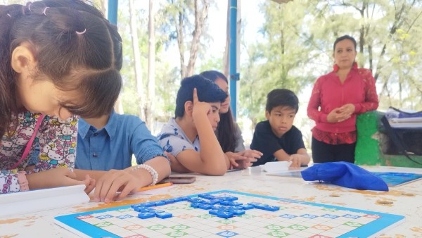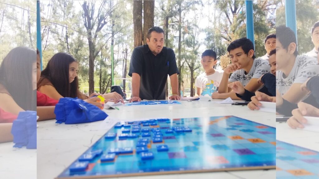 Son alumnos de la primaria pública Martín Muñoz. El juego consiste en formar palabras. Cada letra tiene un puntaje que puede incrementar cuando la casilla por donde se forman las filas, así bonifica al jugador. Entrenan en el Parque Chapalita.
