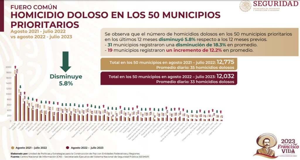 Entre estas 50 ciudades que acumulan 12 mil 32 homicidios dolosos, lo que significa un promedio de 33 casos por día.