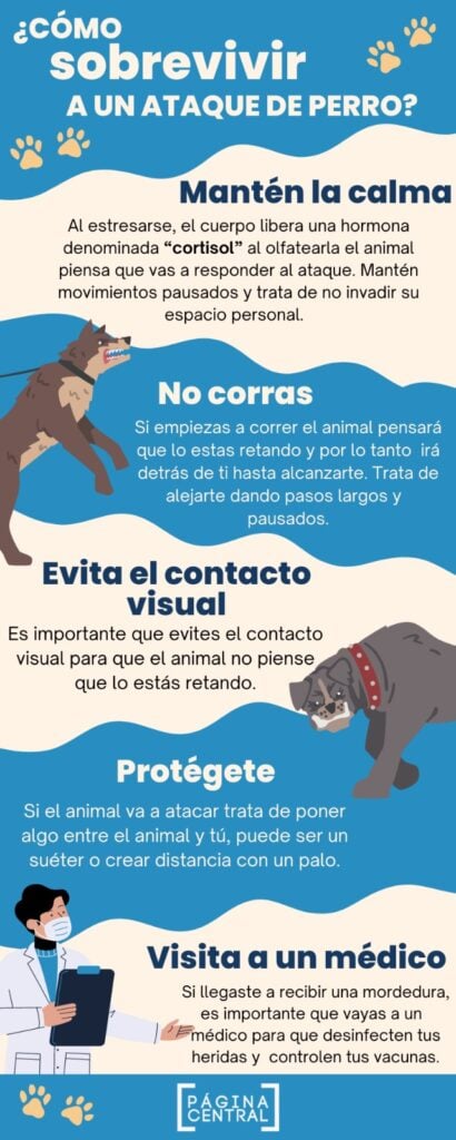Cuando te enfrentes a un ataque canino, lo primero que tienes que hacer es mantener la calma, ya que al estresarte tu cuerpo libera una hormona denominada cortisol, que cuando el perro la olfatea piensa que vas a responder al ataque. Mantén movimientos pausados y trata de no invadir su espacio personal.