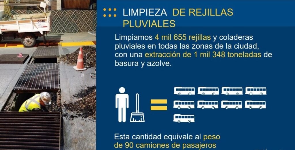 Se limpiaron 4 mil 655 rejillas y coladeras pluviales en toda la ciudad, con una extracción de mil 348 toneladas de basura y azolve.