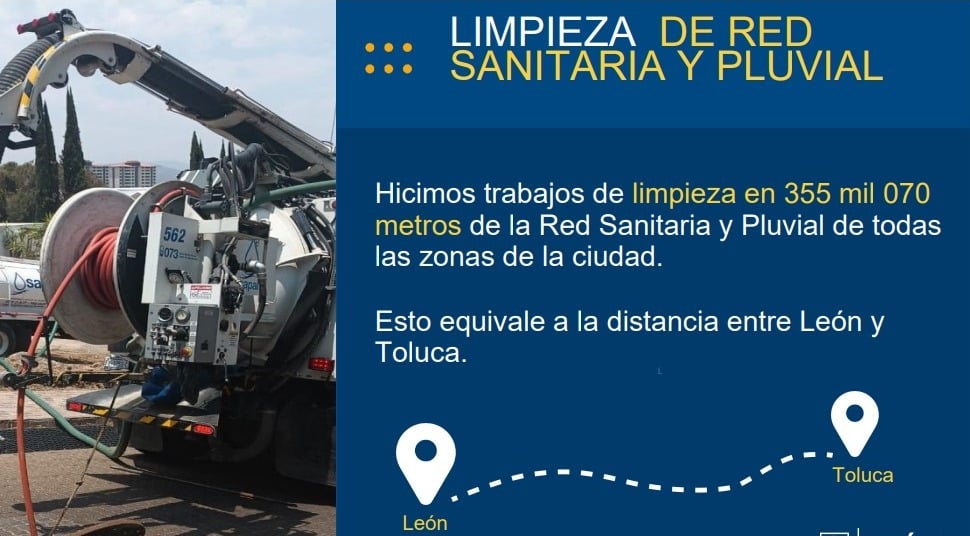 A través del Sistema de Agua Potable y Alcantarillado de León, se realizó la limpieza de 355 mil 70 metros de la red sanitaria y pluvial de toda la ciudad, lo que equivale la distancia entre León y Toluca.