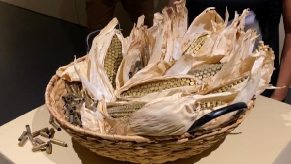 A través de su obra ‘Origen y sustento’, muestra una canasta mazorcas hechas con casquillos de balas.