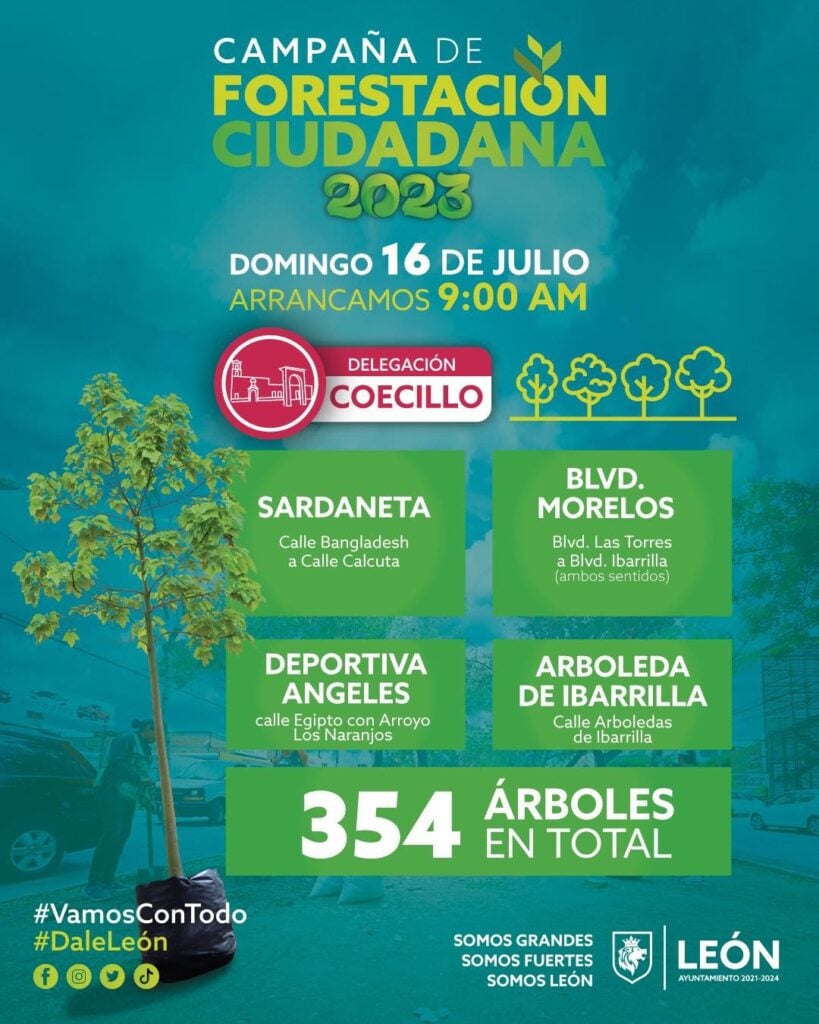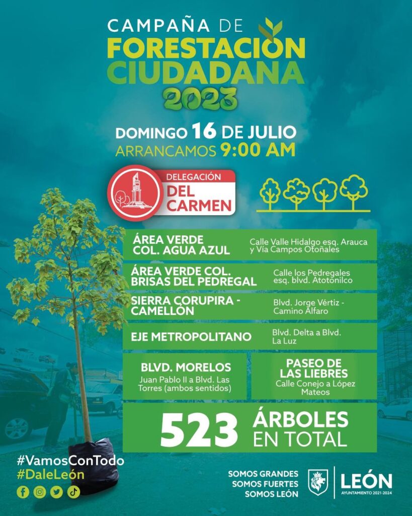 Esta actividad forma parte de la meta anual para lograr la plantación de 11 mil árboles de 26 especies. Las delegaciones que más plantación tendrán son: Del Carmen con 523 árboles, Coecillo con 354 árboles y Cerro Gordo con 275.