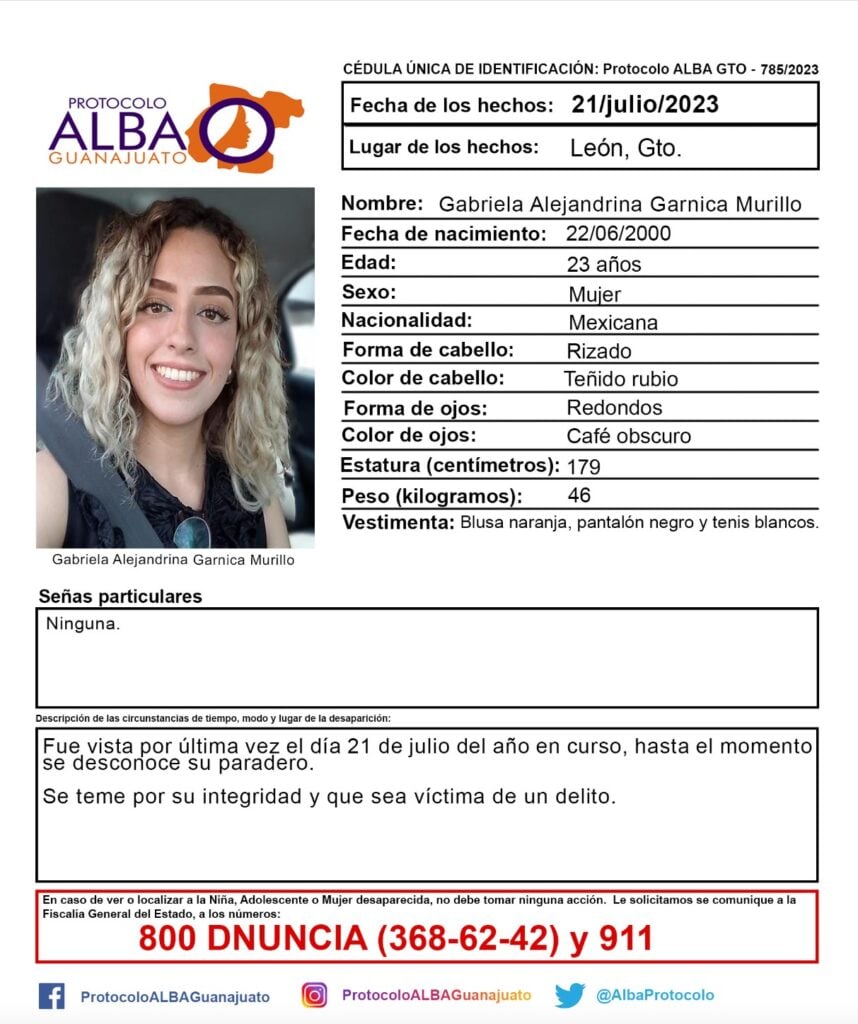 A través del Protocolo Alba, se emitió la ficha de búsqueda de la recién egresada de enfermería de la Universidad La Salle, Gabriela Alejandrina Garnica Murillo, de quien se detalla tiene el cabello rizado, teñido rubio, y ojos redondos color obscuro.