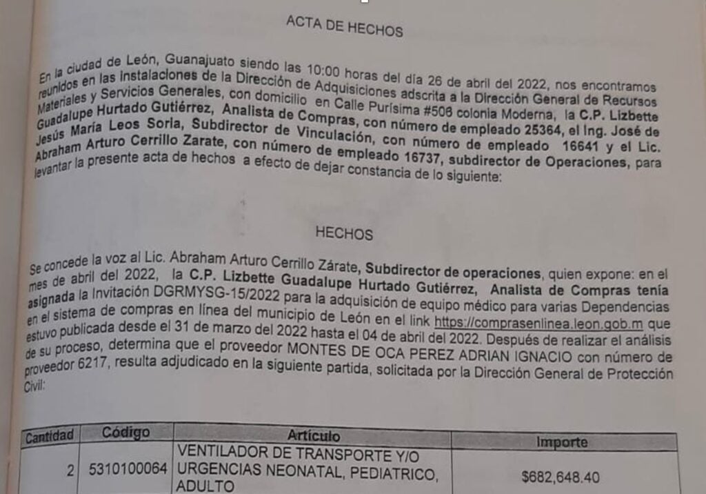 Funcionarios de la Dirección de Adquisiciones del municipio de León habrían falsificado documentos oficiales para justificar ante la Contraloría Municipal la compra de equipos de ventiladores médicos a un proveedor diferente al ganador, denunció el abogado y secretario de organización de Movimiento Ciudadano, Juan Pablo Delgado Miranda.