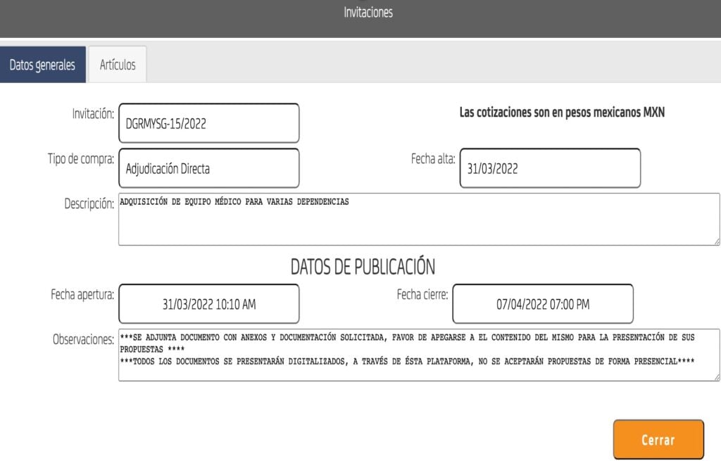 Incluso en el Sistema de Compras en Línea continúa apareciendo en la invitación DGRMYSG-15/2022 como el ganador de la misma.