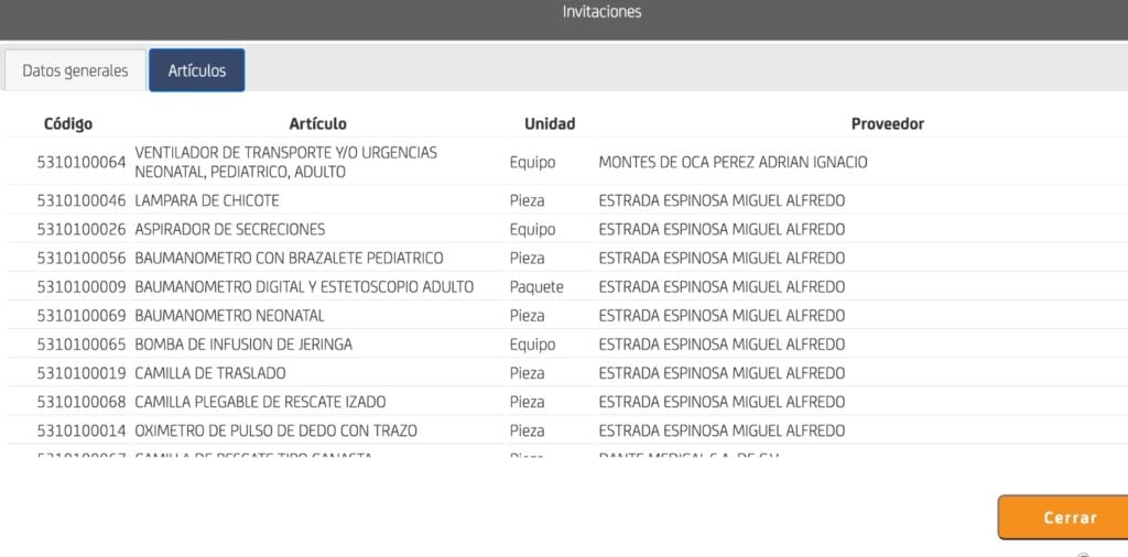 La invitación DGRMYSG-15/2022 para la adquisición de equipo médico para varias dependencias (Ventiladores de Transporte y/o Urgencias neonatal, pediátrico, adulto) publicada el 31 de marzo del 2022 y que finalizó con la adjudicación al proveedor Montes de Oca Pérez, no concluyó en la firma de un contrato que implicada la compra de equipo por un valor de 682 mil 648 pesos.