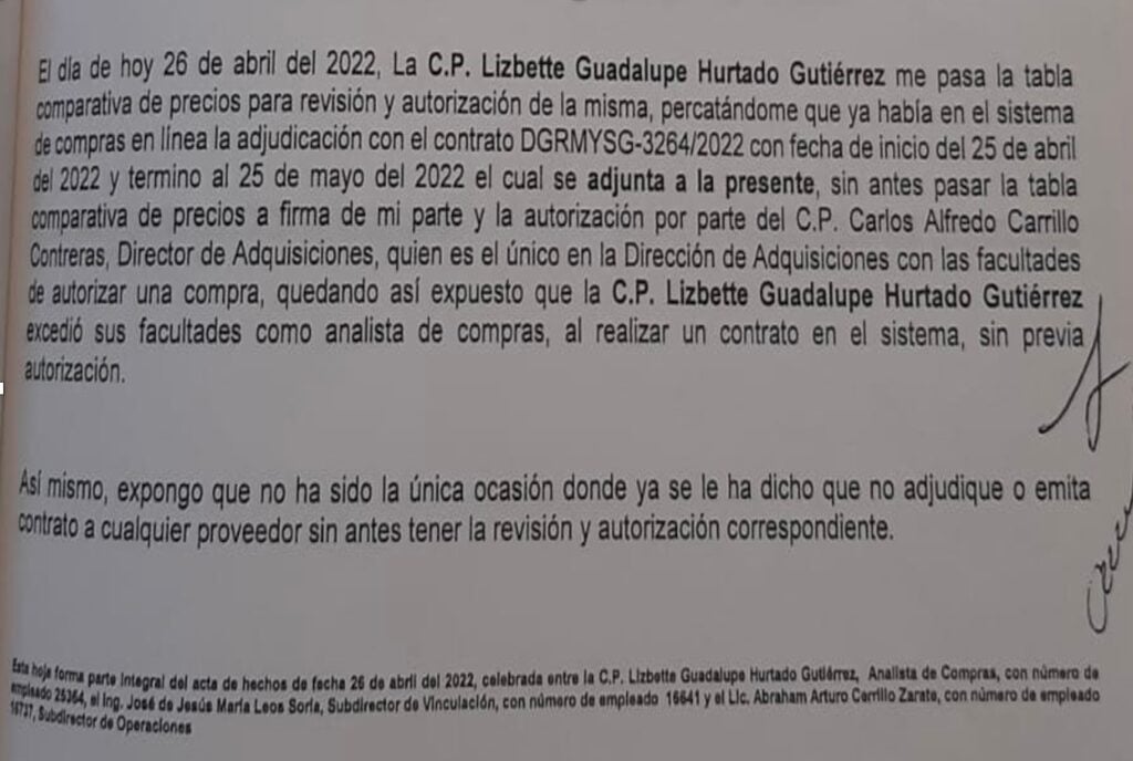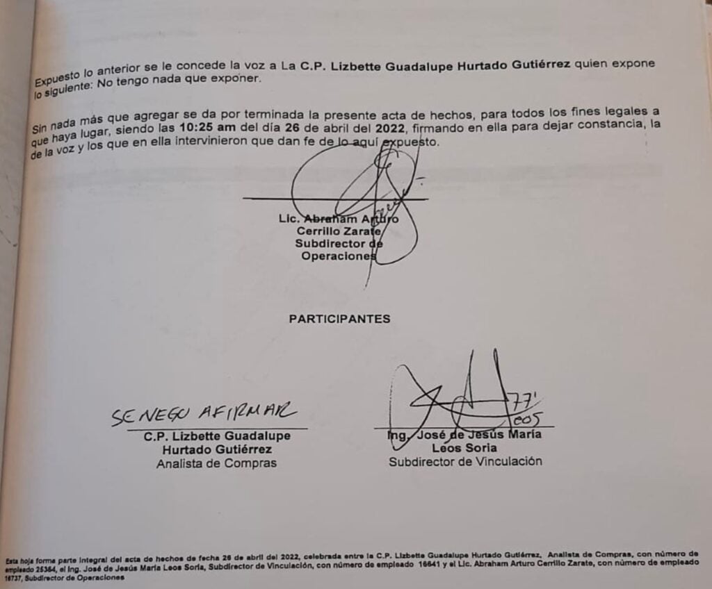 Dicha Acta de Hechos, firmada por el Subdirector de Operaciones, Abraham Arturo Cerrillo Zárate; y el sub director de Vinculación, José de Jesús María Leos Soria, con la frase “Se Negó a Firmar” en el nombre de la analista Lizbett Hurtado Gutiérrez, narra que esta última habría emitido el contrato sin la revisión y autorización correspondiente. Este documento es el que se entregó a la Contraloría. Incluso sin la firma de testigos que suele llevarlo este tipo de documentos.