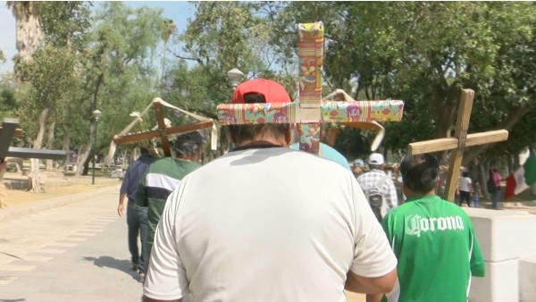 Su papá falleció cuando él tenía 3 años. Por eso no alcanzó a aprender el oficio. Lo relata mientras espera bajo la sombra de un árbol a que comience el recorrido. A su lado, un joven lanzacohetes para acentuar el ambiente de festejo. "Y no aprendí mucho, pero sí más o menos a hacer cosas sencillitas, pero me gusta mucho por él, y tengo amigos albañiles que son buenos. Para eso no hay edad". Sin embargo, su madre se encargó de pasar la estafeta: una cruz de madera con más de 60 años de existencia, la misma con la que sigue a la peregrinación que va del Parque Hidalgo al templo de San Juan Bosco.
