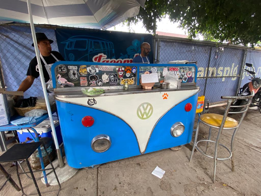 León, Guanajuato - Los últimos 15 años, luego de ser curtidor, Javier se dedicó a vender tacos, y para ser diferente y distinguirse entre su competencia, a su carrito le puso el frente de una combi azul, aunque  lo cambia de color cada año. “Dale una coca al chalán, eres un mal jefe”, le grita Javier a un cliente, mientras machetea carne para seguir despachando. Entre quienes comen hay risas, pues al ser el sitio de desayuno diario para muchos, ya hay una fraternidad entre todos, "con vigas y albures de por medio", afirma.