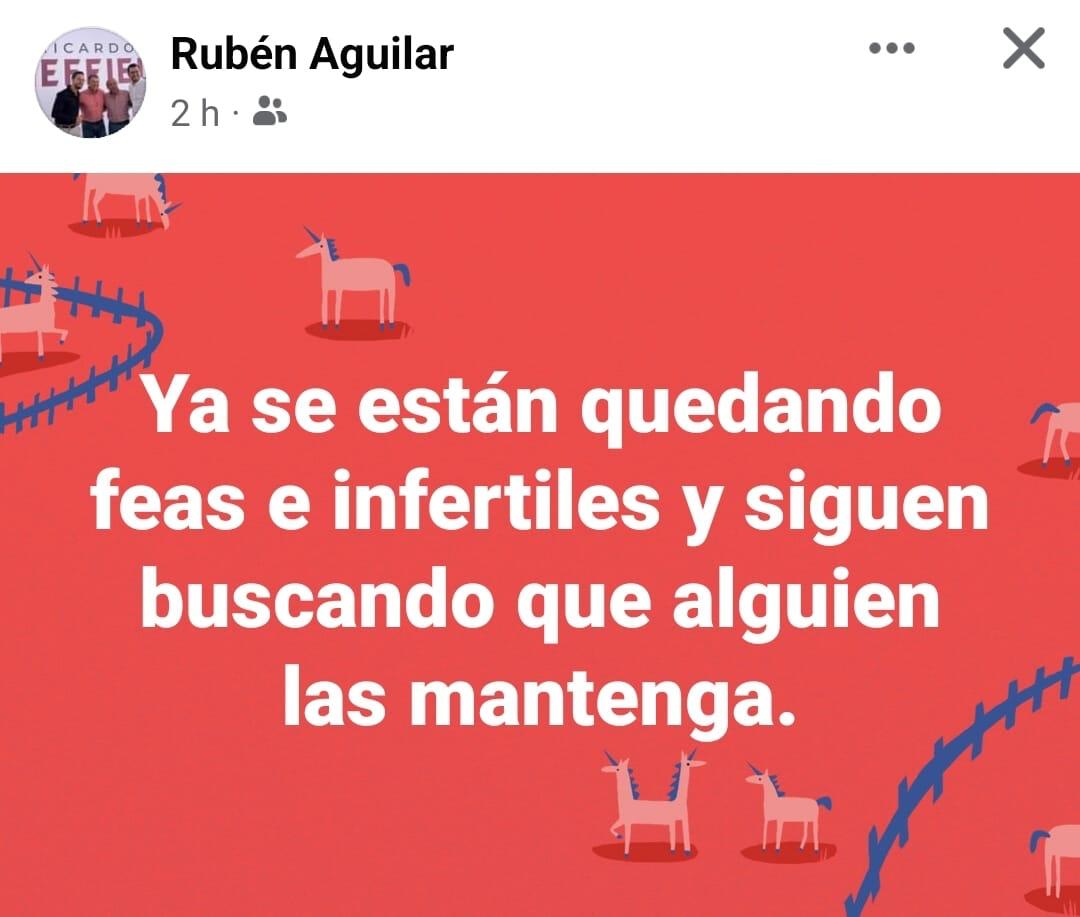 Rubén Aguilar publicó un post en el que se lee: “Ya se están quedando feas e infértiles (sic) y siguen buscando que alguien las mantenga”.