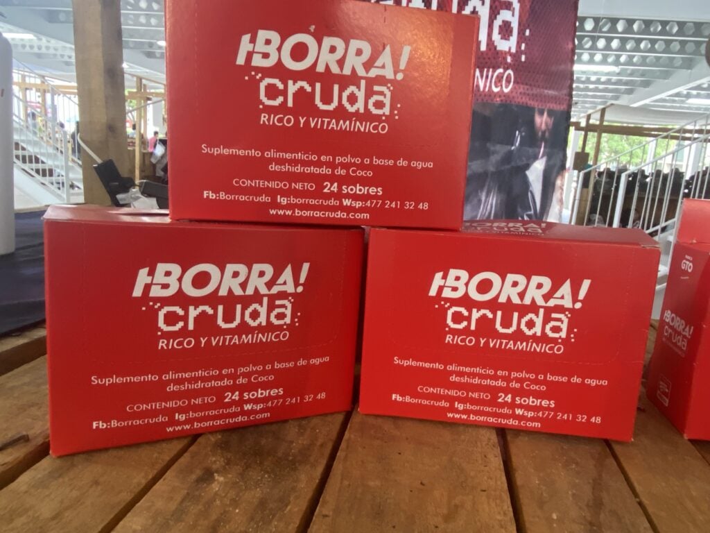 “Borra Cruda”. Este es un suplemento alimenticio en polvo elaborado a base de agua deshidratada de coco, té verde, vitaminas del complejo B y C.