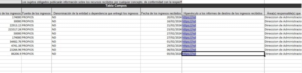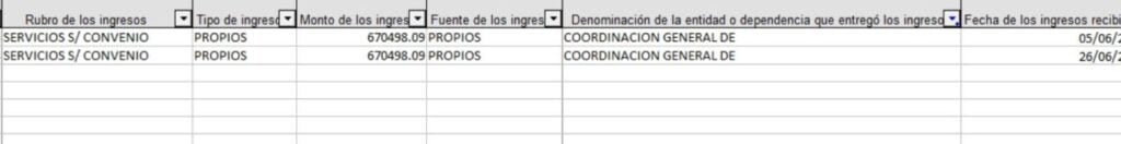Por ejemplo, en el apartado de ingresos se explica que se recibieron 1 millón 340 mil pesos en dos exhibiciones en lo que va del 2024, por parte de la “COORDINACIÓN GENERAL DE” y no completa el registro.