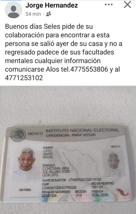 León, Guanajuato - Familiares y vecinos se encuentran en alerta por un adulto mayor desaparecido identificado como Miguel López Amaro; sufre alzheimer y salió de su domicilio el martes alrededor de las 6 de la tarde en la colonia Killian.