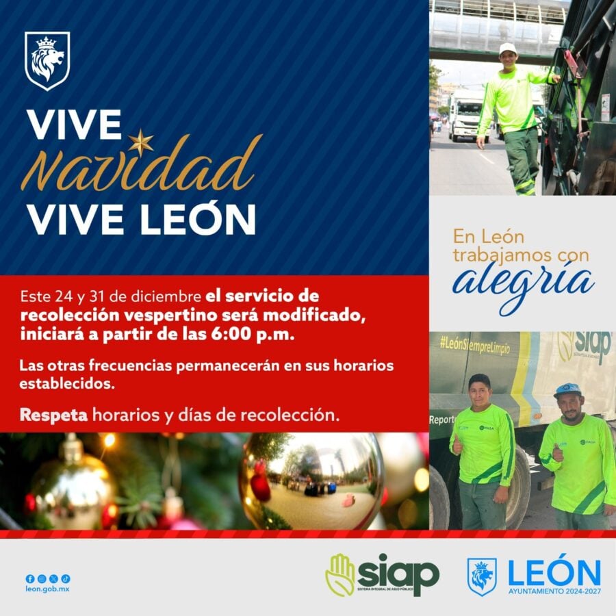 Únicamente la tarde del 24 de diciembre y del 31 de diciembre la recolección vespertina iniciará a las 18 horas.Se pidió a la población a respetar los días y horarios del servicio de recolección de basura para evitar acumulación de residuos.Lee también: 'Yo quiero un León más limpio' pone a trabajar a 250 organizaciones