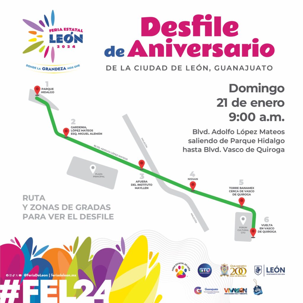 Además, el Municipio de León ya compartió la ruta total del desfile, que recorrerá el bulevar Adolfo López Mateos en el tramo entre el Parque Hidalgo y el bulevar Vasco de Quiroga. [caption id="attachment_194493" align="alignnone" width="1024"]