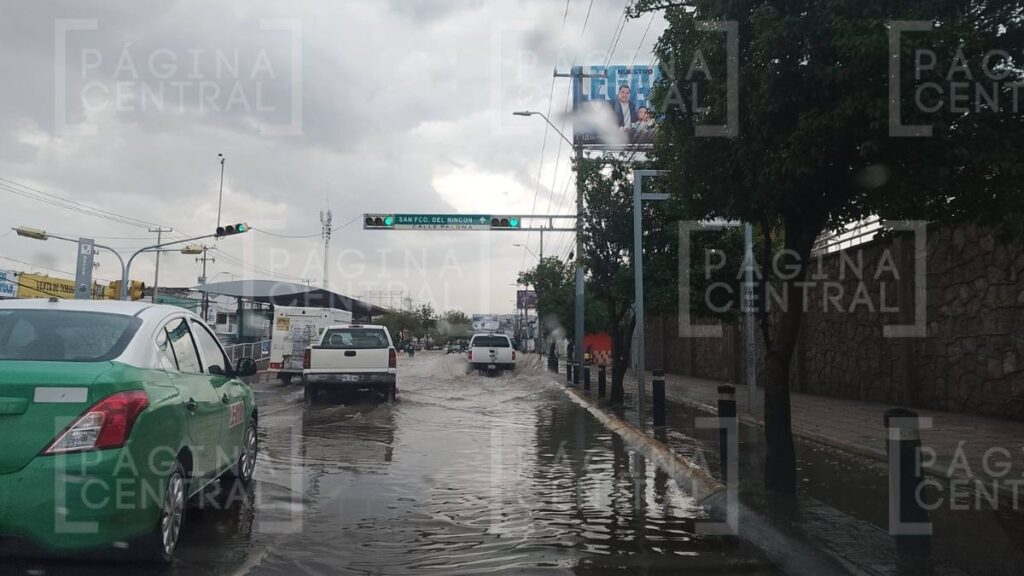León, Guanajuato - Un aguacero que empezó después de la 1 de la tarde causó caos vial en diferentes puntos de la ciudad, así como árboles caídos por los fuertes vientos.