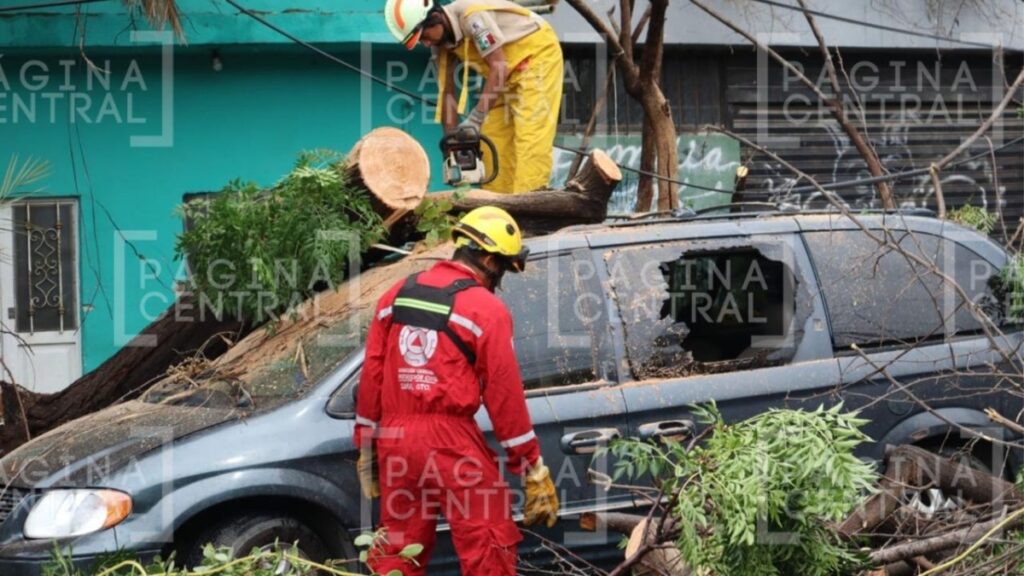 En la calle Tierra Blanca, entre Río Mayo y Río Santiago, en la colonia San Miguel, un árbol cayó sobre una camioneta. Hasta el momento se desconoce si hay personas heridas.