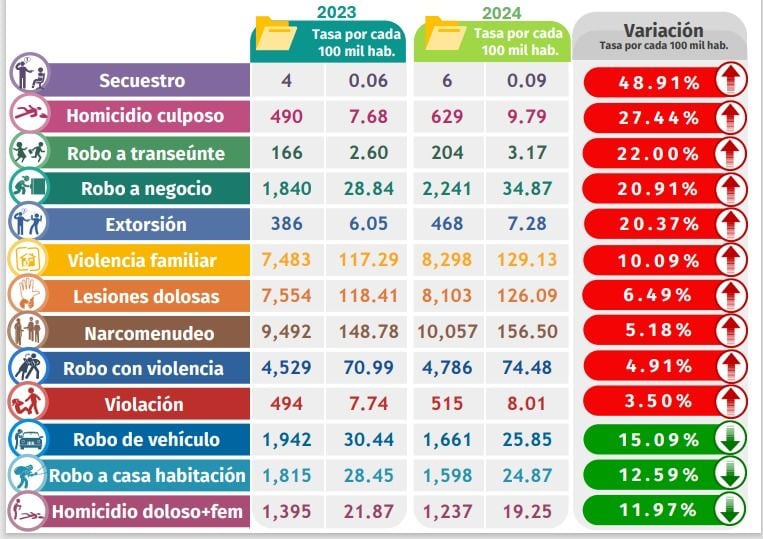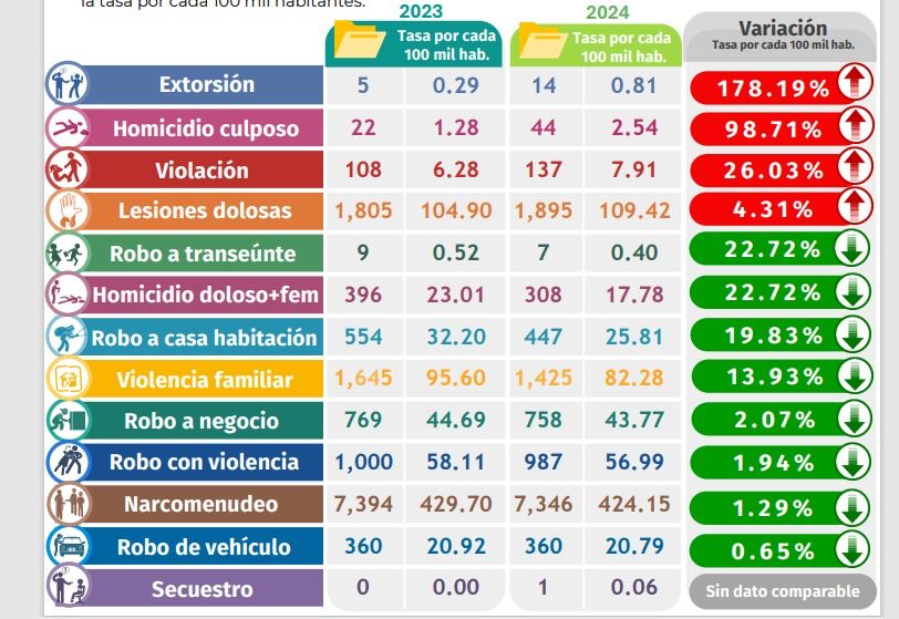 Aumentaron extorsión con 178 %, homicidios culposos con 98.71 %, violación con 26 % y lesiones dolosas con 4.31 %. A la baja se identificó el robo a transeúnte, homicidio doloso, robo a casa habitación robo a negocio, narcomenudeo, robo de vehículo y secuestro”.