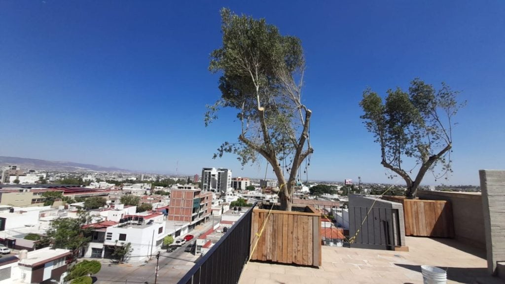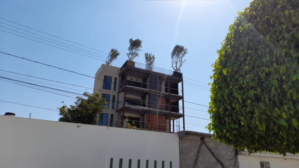 Paseando por las calles de la colonia Panorama, llama la atención un edificio en construcción que en su azotea se levanta un cuarteto de árboles, algo muy inusual en un complejo habitacional, pues quizá algunos tengan plantas, arbustos o incluso jardines, pero árboles como tal, ciertamente es muy sui géneris.
