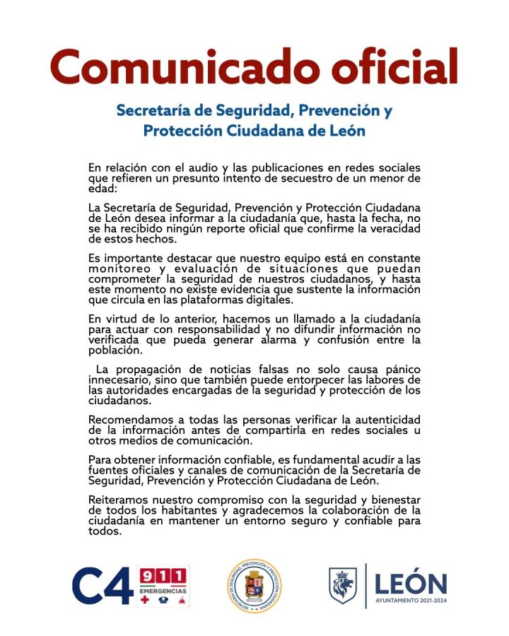 Ante la alarma que esto causó en los leoneses, la Secretaría de Seguridad, Prevención y Protección Ciudadana del Municipio dijo que a la fecha no se han recibido reportes oficiales que confirmen que eso sea real.